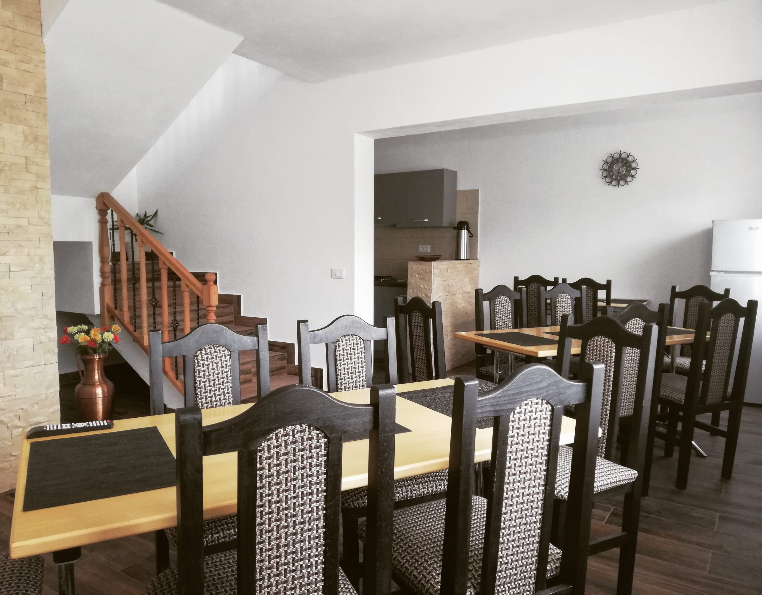 Sala mare de mese este un spațiu primitor, ideal pentru a te bucura de mese delicioase într-o atmosferă relaxantă. Cu un design elegant și ferestre largi ce oferă lumină naturală din plin, această încăpere creează un cadru perfect pentru momente plăcute alături de familie și prieteni. Fie că servești micul dejun înainte de o zi activă în natură sau cina într-un ambient cald și confortabil, sala de mese îți oferă tot confortul necesar pentru o experiență autentică la munte.